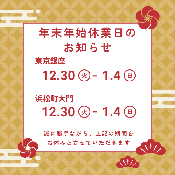 12/30(土)~1/4(木) :東京銀座店・浜松町大門店ともに年末年始休業